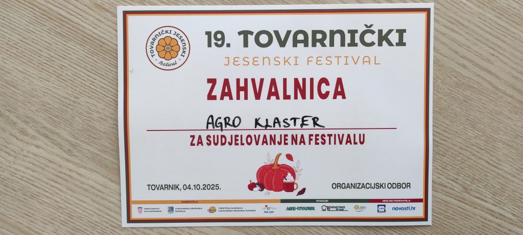 Ovoga se vikenda u Tovarniku održao 18. Tovarnički jesenski festival. Vrhunac bogatih događanja je već tradicionalno ‘Bundevijada”, odnosno mjerenje i izbor najteže i najduže bundeve proizvedene u ovoj godini.Nagrada za najveću i najtežu bundevu ove godine ide u Baranju a dobitnik je Ivica Ribarić iz Kozarca.Njegova bundeva je težila 809 kg, druga najteža bundeva je također iz Kozarca (729 kg) a proizvela ju je Ljiljana Ribarić. Treća nagrada ide u Lovas a bundevu od 215 kg donio je Krunoslav Peić. Osim “Bundevijade” u okviru festivala je organizirano i ocjenjivanje graha i pekmeza. Agro-klaster je imao svoj štand gdje je promovirao domaće proizvode naših OPG-ova. Čestitke nagrađenima ali i organizatorima ove vrlo posjećene i događanjima bogate manifestacije.