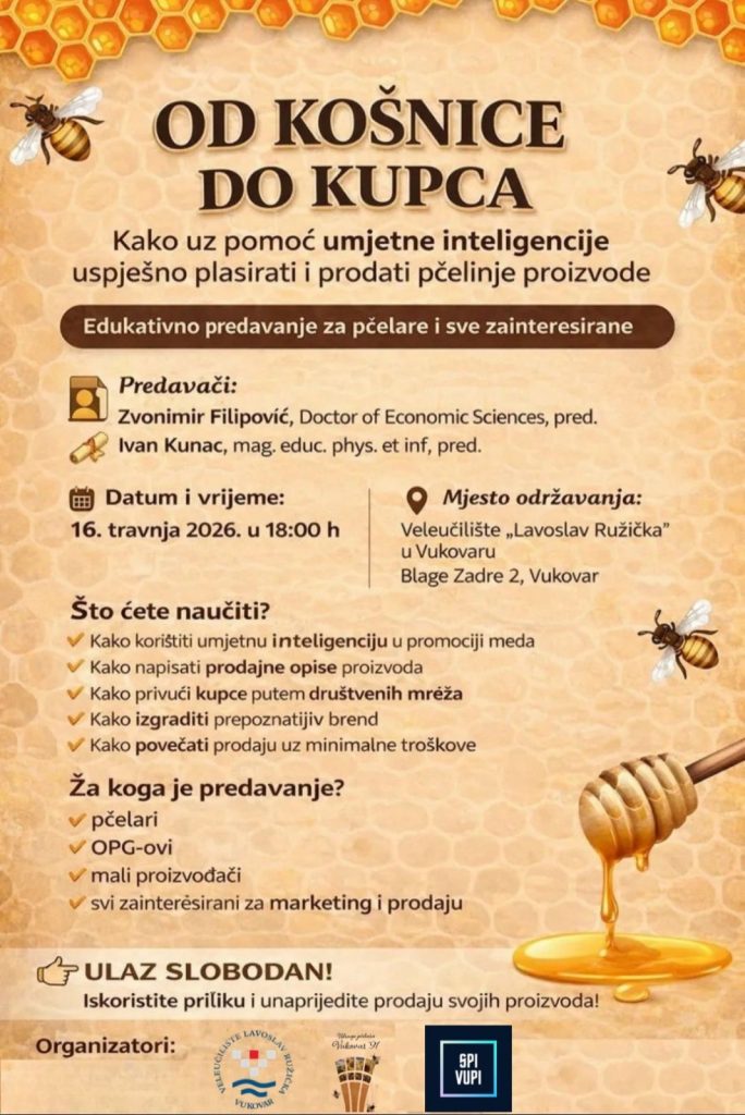 U Vukovar, 16. travnja, održano je edukativno predavanje za pčelare i sve zainteresirane. Tema predavanja je bila umjetna inteligencija i kako može pomoći pčelarima u njihovom poslu i aktivnostima.